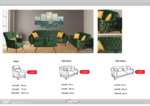 KOLTUK TAKIMI / KLAS 3+2+B Berjer İkili Koltuk Üçlü Koltuk 10,500TL 18,600TL 24,500TL Derinlik : 95 cm Derinlik : 95 cm Genişlik : 180 cm Genişlik : 240 cm Yükseklik : 90 cm Yükseklik : 90 cm 24