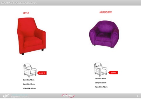 KOLTUK / ÇOCUK KOLTUKLARI BEST MODERİN 2,100 TL 2,100TL Derinlik : 40 cm Derinlik : 40 cm Genişlik : 55 cm Genişlik : 45 cm Yükseklik : 43 cm Yükseklik : 49 cm 41