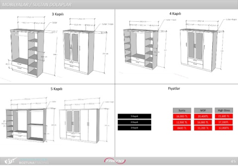 MOBİLYALAR / SULTAN DOLAPLAR 3 Kapılı 4 Kapılı 5 Kapılı Fiyatlar Sunta MDF High Gloss 5 Kapılı 16,000 TL 20,400TL 21,600 TL 4 Kapılı 12,500 TL 16,000 TL 17,200TL 3 Kapılı 8400 TL 11,200 TL 12,000TL 45